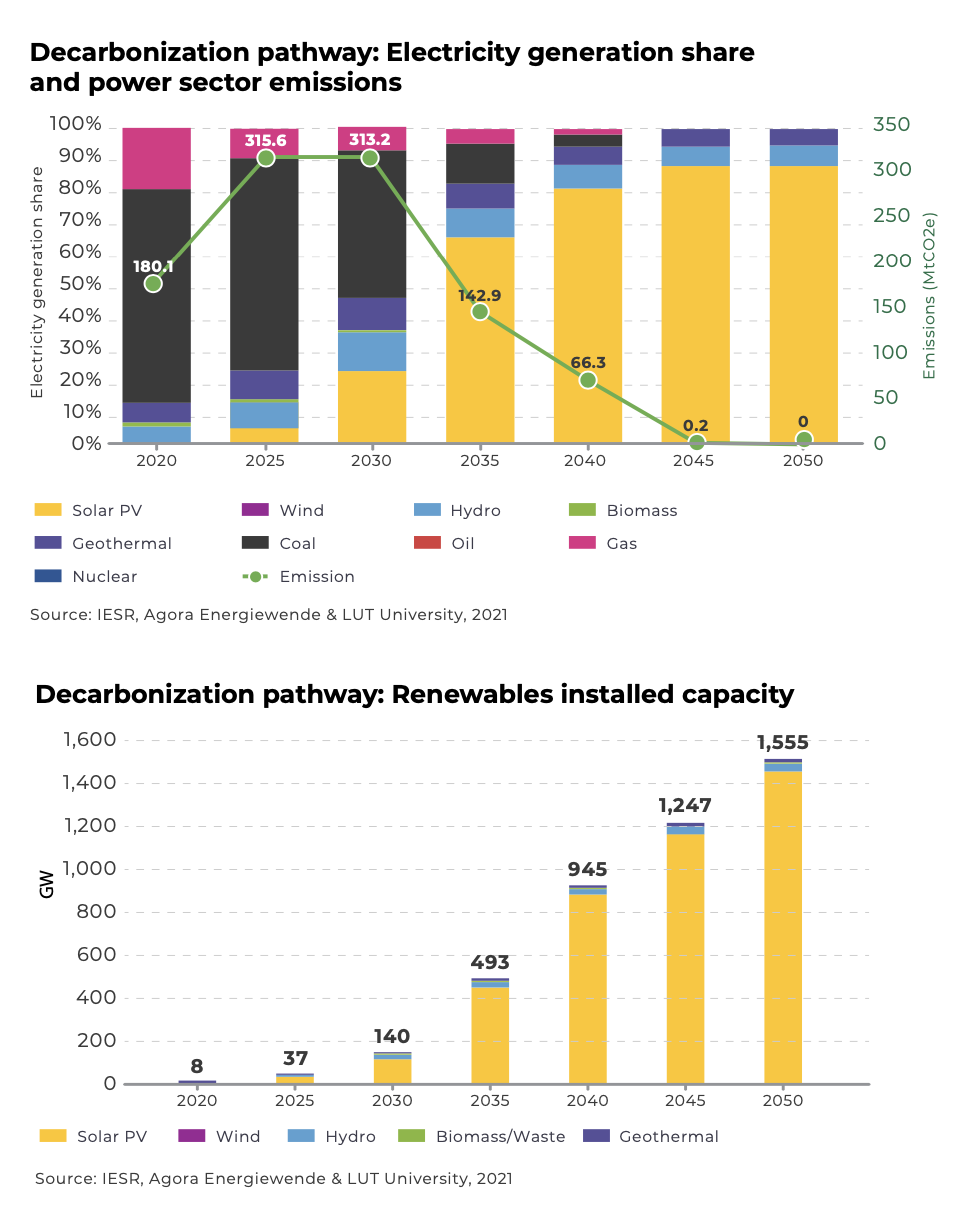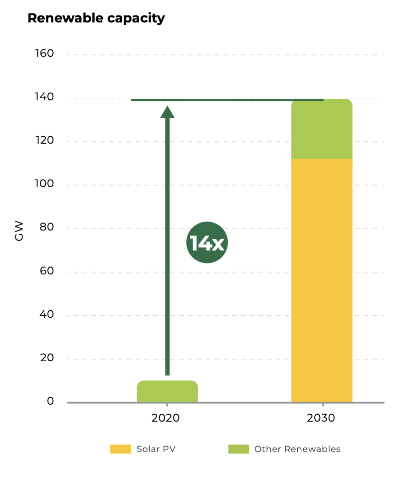 Solar PV needs to grow 10–11 GW/year. RE capacity needs to grow 14x