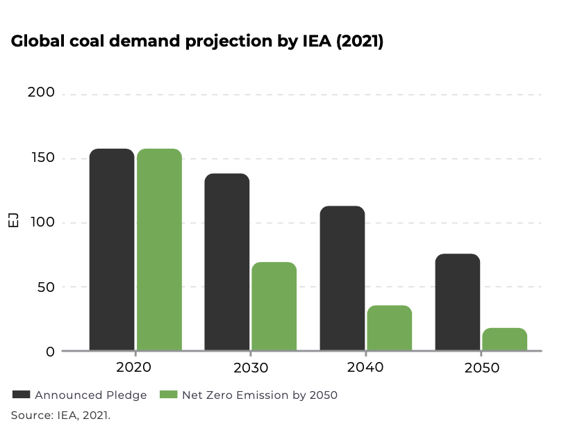 IEA predicts that global coal demand will decline by 9% in 2030, and 50% in 2050 if all countries fully implement their announced climate pledges as of mid-2021. Somehow I doubt they will fulfill their pledges on time.