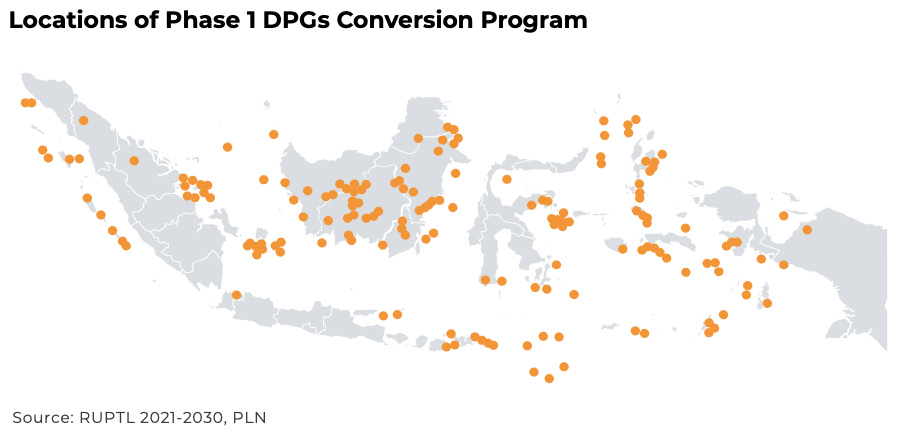 Phase 2, PLN will replace DPGs with equivalent capacities of 500 MW and 1300 MW, respectively (Kompas, 2021). The auctions for the second phase are set to begin in 2022, with a COD date of 2024/2025.